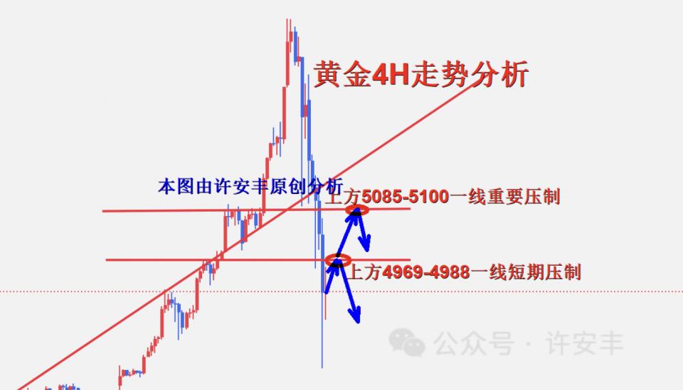 1、黄金反弹4969-88一线轻仓空,反弹5000-5020补仓空,止损5035一线,目标4830-35一线,破位继续持有;