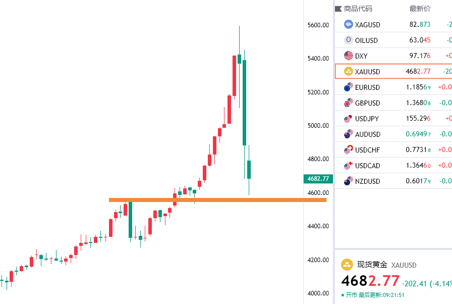 黄金三个交易日不到的时间从最高点5598一线跌到了发文时间为止的最低点4584一线,超过1000美金的跌幅,也是再度见证了历史,深刻见识到了金融市场的魅力以及奇妙之处,同时风险也是巨大,在此提示大家做好风控,不要做超出自己能力范畴的事情。黄金可以说成也特朗普,跌也特朗普,近期的大涨主要因素其一是中东,俄乌,美伊等地缘政治冲突引发的避险情绪推动,其二就是特朗普干涉美联储要求其宽松,双重利好推动黄金不断走预期拉出历史高位,周五随着特朗普提名凯文·沃什担任下一届美联储主席,作为一名资深鹰派官员,这一举动无疑是打了自己的脸,瞬间引爆市场,美元指数低位暴力反弹,金银高位走出踩踏恐慌性出逃的大跌行情,周五当天暴跌近800美金,日内低开低走之后反抽到4884然后二次杀跌到目前的低多4584一线然后迅速反抽,基本是回踩到了前期大涨的起涨点平台支撑,日内看好黄金反复探底企稳后走出新一轮的上涨,这波跌势差不多到位,日内关注4900站稳情况,下方依托4550/4500强支撑带回踩多为主。