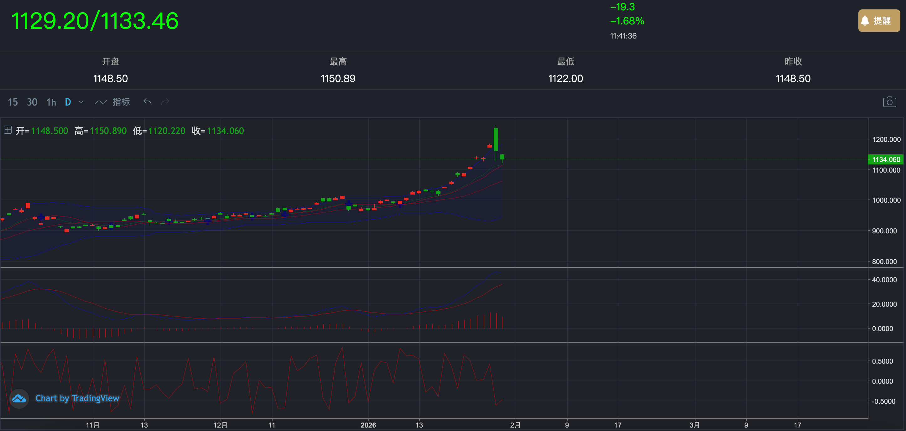 从日线来看,融通金在前期加速拉升后,当前进入高位回吐阶段(与国际黄金价格相同)。价格在冲高至 1150 上方后未能有效站稳,随后出现明显的获利了结,日内一度回落至 1122 附近,波动幅度开始放大。