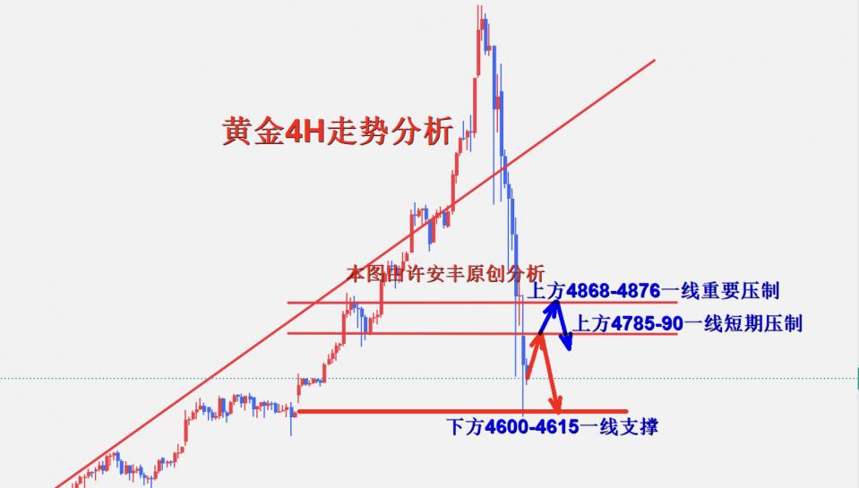 上周五随着特朗普提名下一届美联储主席,作为一名资深鹰派官员,这一举动无疑是打了自己的脸,瞬间引爆市场,美元指数低位暴力反弹,金银高位走出踩踏恐慌性出逃的大跌行情,周五当天暴跌近800美金,黄金三个交易日不到的时间从最高点5598一线跌到最低点4584一线,超过1000美金的跌幅刷新历史,同时风险也是巨大,在此提示大家做好风控,不要做超出自己能力范畴的事情,操作上反弹承压不破找机会做空。对黄金感兴趣却无从下手或者操作不理想的朋友可以与老许本人前来沟通交流。