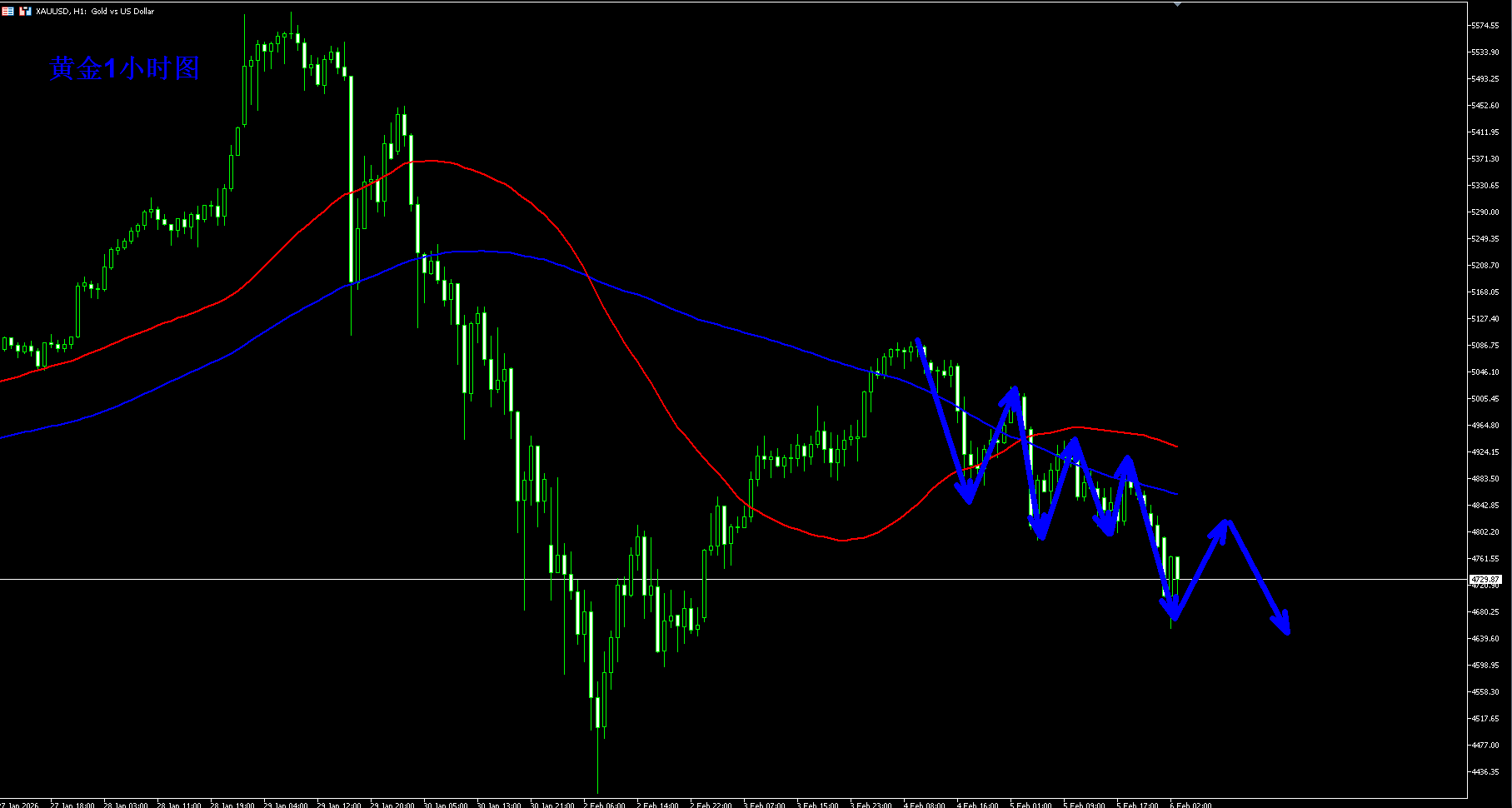 黄金周二周三小时级别强势反抽,不过并未让黄金就此反转,就是一个偏强势的反弹;周四黄金开始高位回落,今天继续延续弱势下行,黄金1小时级别整体还是偏于弱势,黄金短期可能下跌还有动能。黄金短期关注4820附近的阻力压制,如果不破可以先空,下方如果跌破4600一线,那么黄金大概率还将继续测试4400附近的低点。