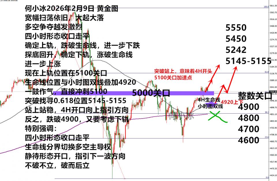 现在又再度来到5000关口上下,选择继续围绕5003-4993范围去低多,看价格二次确定支撑完成,从而再去找寻5030-5040位置,破白盘高点,继而找寻5100区域,然后关注四小时形态是否开口