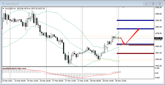 硅谷银行复牌暴跌99%,美元避险上扬 黄金(日内) 大概率:于1966.00(P点)之上看涨(穆迪枢轴线) 小概率:于1966.00(P点)之下看跌 其他技术点评: MACD在0轴之上,代表多头意愿强,同时价格运行在布林带中