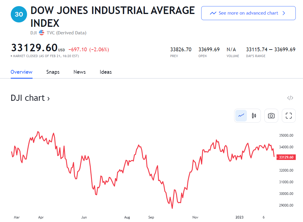 美股创最差单日表现,三大股指齐跌逾2% 2月21日,结束总统日休市一天后,美股全天不断走低并集体收于日低附近,三大指数跌幅均超2%。截至收盘,道琼斯指数跌2.06%,报33,129.60点;标普500指数跌2.0