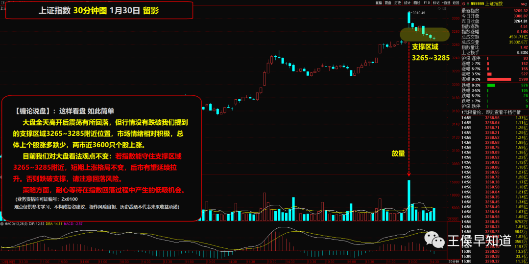 一、大势研判 【指数复盘】 大盘昨天高开后震荡有所回落,但行情没有跌破我们提到的支撑区域3265~3285附近位置,市场情绪相对积极,总体上个股涨多跌少,两市近3600只个股上涨。