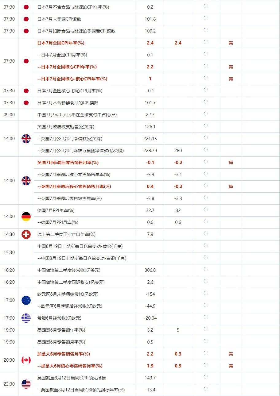 07:30 日本7月全国CPI年率(%) , 前值 2.4 , 预期值 2.4 , 公布值:待发布 07:30 日本7月全国核心CPI年率(%) , 前值 2.2 , 预